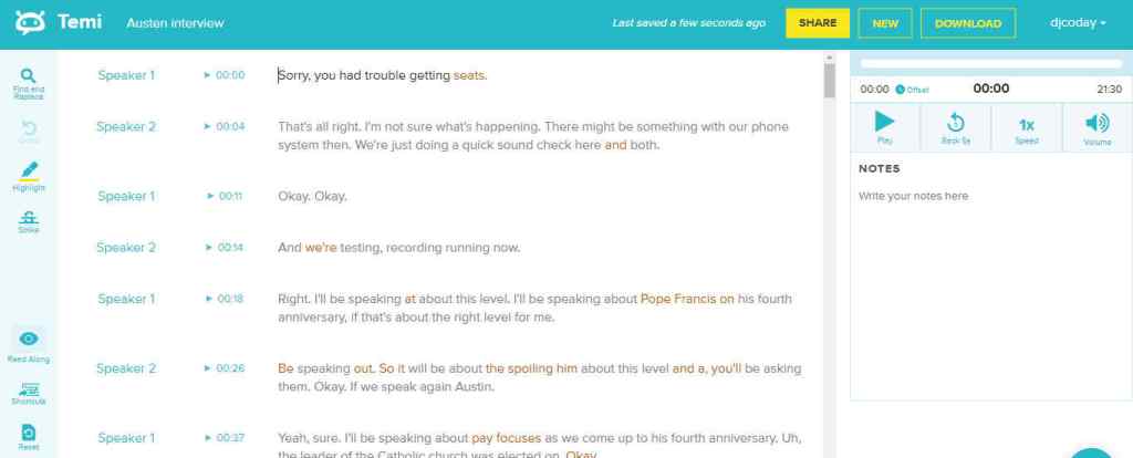 I up loaded a 22-minute conversation between three people: one woman and two men, one of whom had a distinctly non-American accent. Temi performed pretty darn good as far as transcribing the tape word-for-word. It didn’t do quite as well in distinguishing among the three voices.